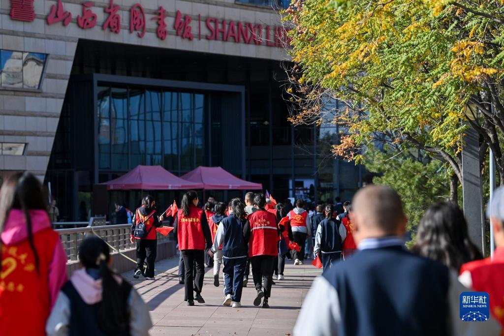 10月13日,志愿者協(xié)助盲校學(xué)生在山西省圖書(shū)館外參觀(guān)。