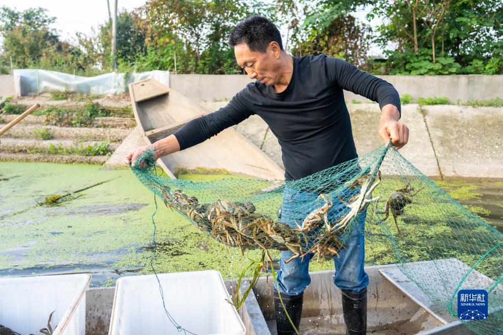 10月14日,在湖南省益陽(yáng)市河壩鎮小康村,蟹農捕撈大閘蟹。
