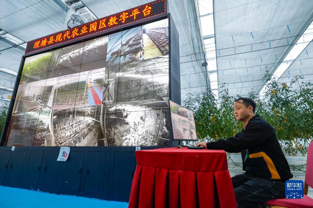 10月13日,理塘縣瑪吉阿米花園農莊負責人丁義通過(guò)理塘縣現代農業(yè)園區數字平臺查看農莊不同區域的運轉情況。