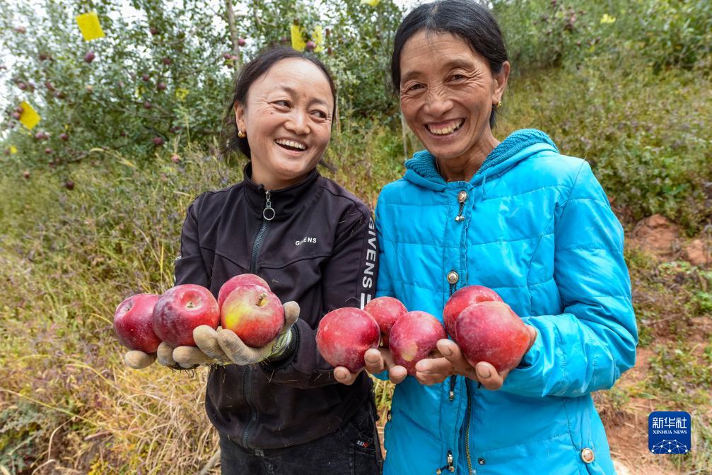 10月13日,在鄉城縣“蘋(píng)果+藏豬”種養循環(huán)現代農業(yè)園區內的有機蘋(píng)果種植示范基地,當地藏族群眾太(左)和藏格展示采摘的蘋(píng)果。