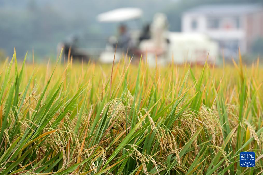 10月13日,在湖南省資興市唐洞街道程水村,農民駕駛收割機收割稻谷。