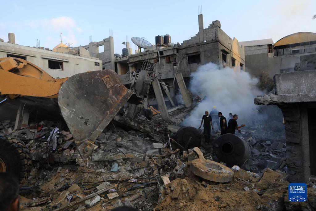 10月14日,在加沙地帶南部城市汗尤尼斯,人們在遭以色列空襲炸毀的建筑中救援。