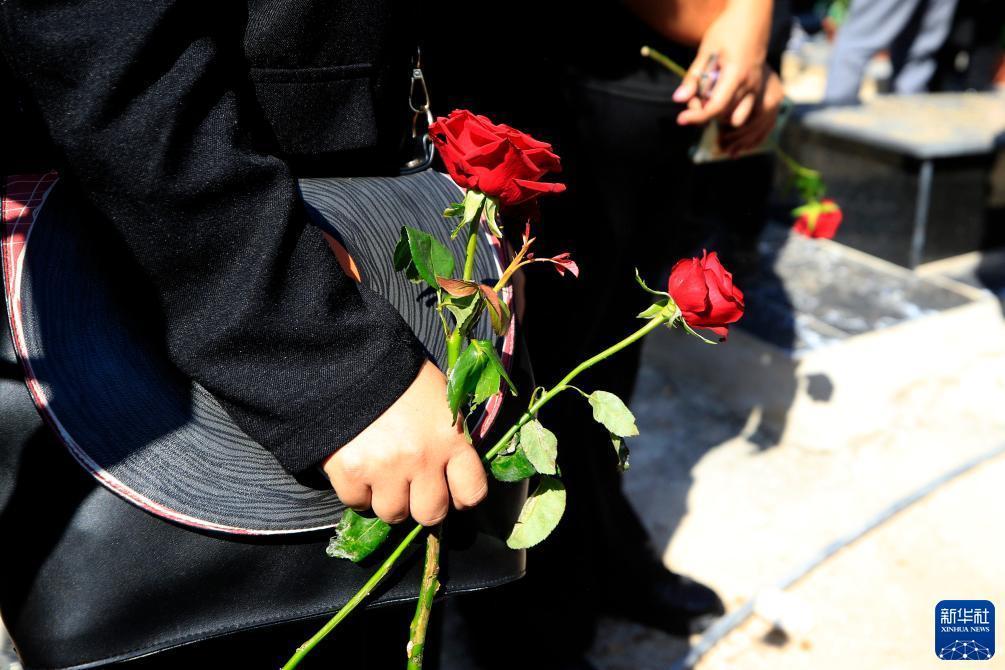 10月14日,黎巴嫩南部希亞姆鎮,黎巴嫩記者手持玫瑰為在以色列轟炸中死亡的攝影記者伊薩姆·阿卜杜拉送葬。