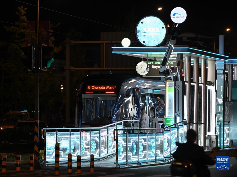 10月13日,在成都市郫都區,一輛2023成都世界科幻大會(huì )主題電車(chē)駛入車(chē)站。