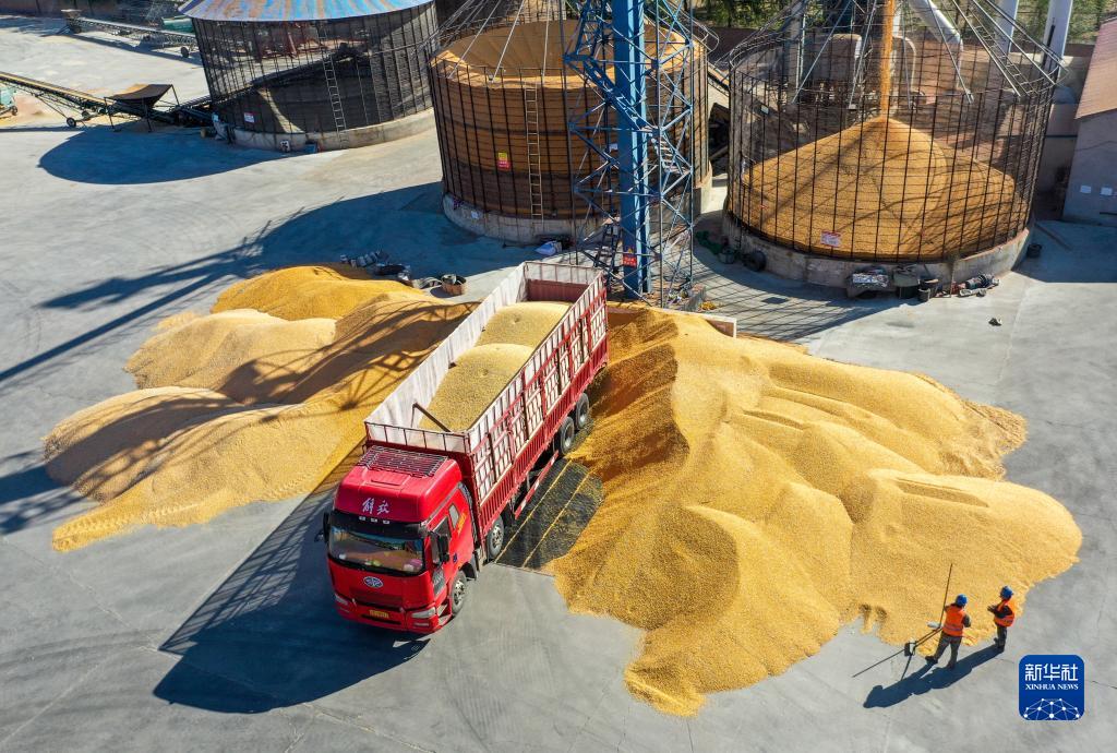 10月15日,在內蒙古通遼市科爾沁左翼中旗腰林毛都鎮一家“糧食銀行”,司機駕駛運糧車(chē)卸糧(無(wú)人機照片)。