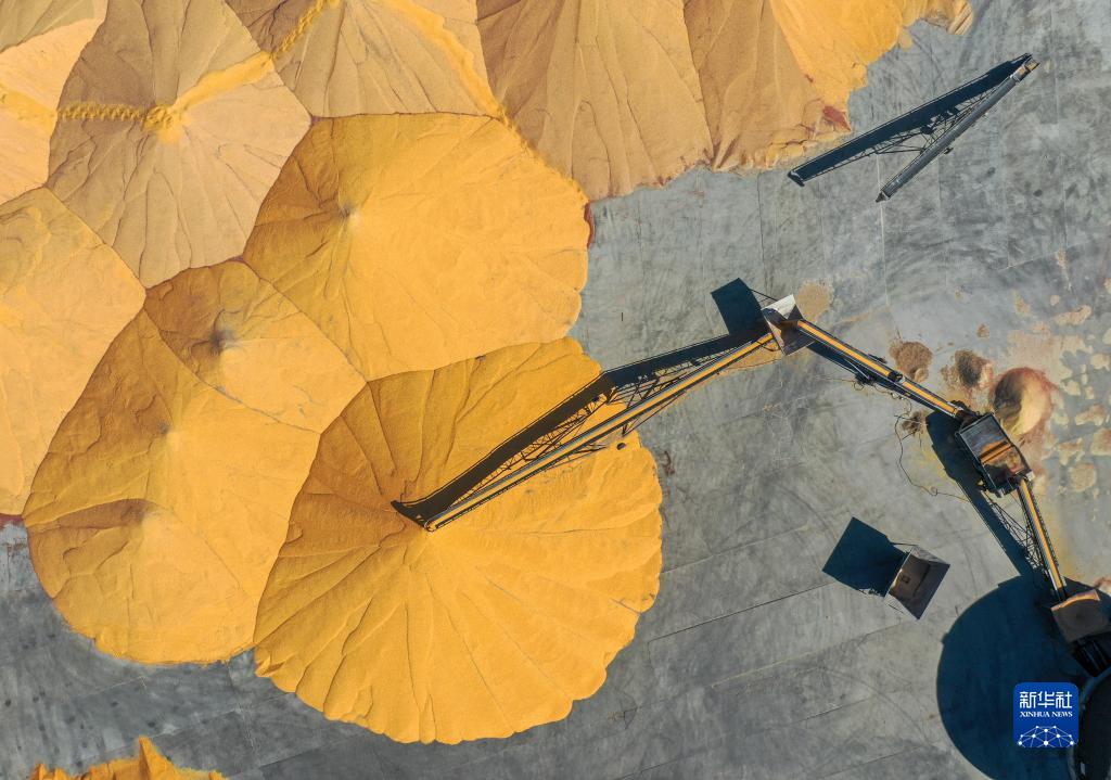 10月15日,在內蒙古通遼市科爾沁左翼中旗腰林毛都鎮一家“糧食銀行”,經(jīng)過(guò)烘干的玉米堆積如山(無(wú)人機照片)。
