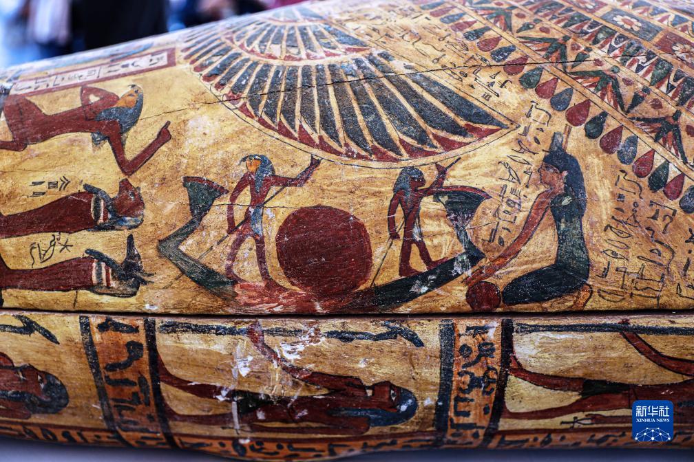 這是10月15日在埃及明亞省考古現場(chǎng)拍攝的彩繪棺槨上的圖案。