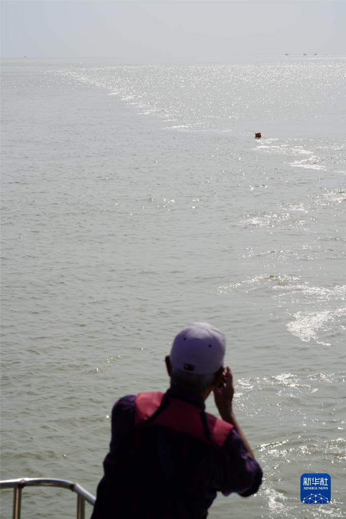 在山東省東營(yíng)市黃河入???,黃河匯入渤海。黃色的河水和藍色的海水之間形成了一條“分界線(xiàn)”,河黃海清,涇渭分明。