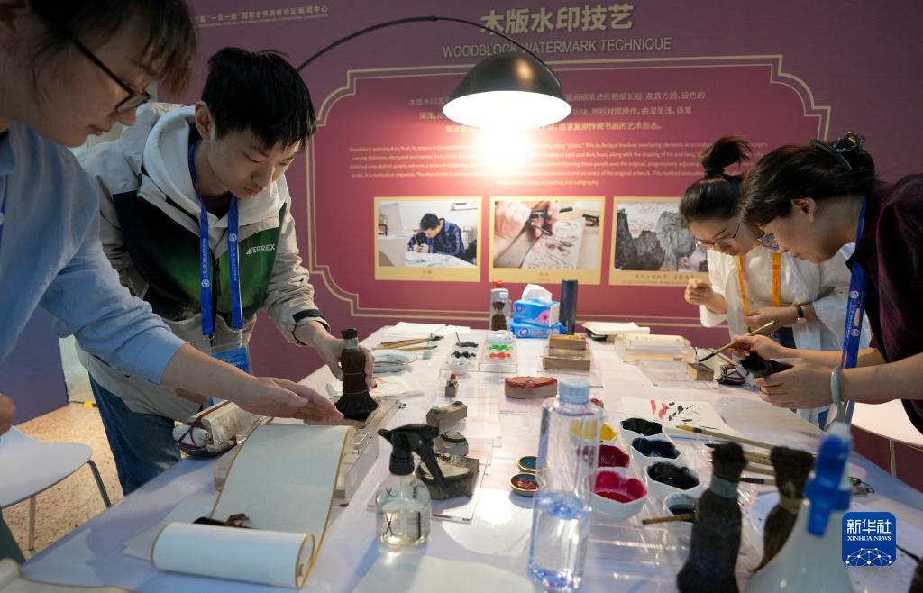 10月16日,在第三屆“一帶一路”國際合作高峰論壇新聞中心,媒體記者體驗木版水印技藝。