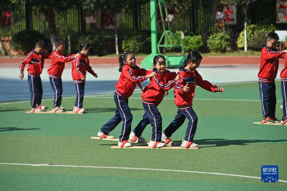 10月16日,在梧州市長(cháng)洲區龍平小學(xué),學(xué)生們在體育課上進(jìn)行板鞋練習。