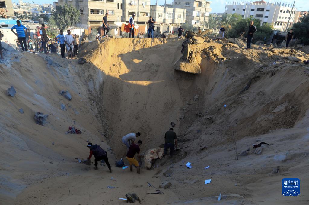 10月16日,在加沙地帶南部城市汗尤尼斯,人們在遭以色列襲擊后的建筑廢墟中救援傷者。