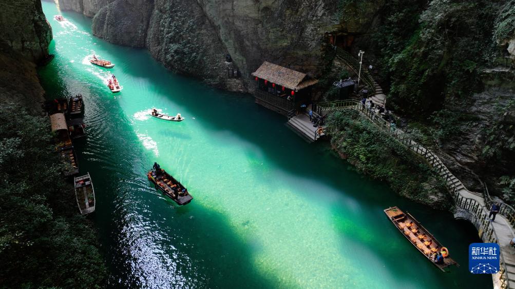 秋日,湖北省恩施土家族苗族自治州鶴峰縣容美鎮屏山村屏山旅游景區吸引眾多游客。屏山旅游景區河水清澈見(jiàn)底,舟行水上如懸浮空中,美如畫(huà)卷。