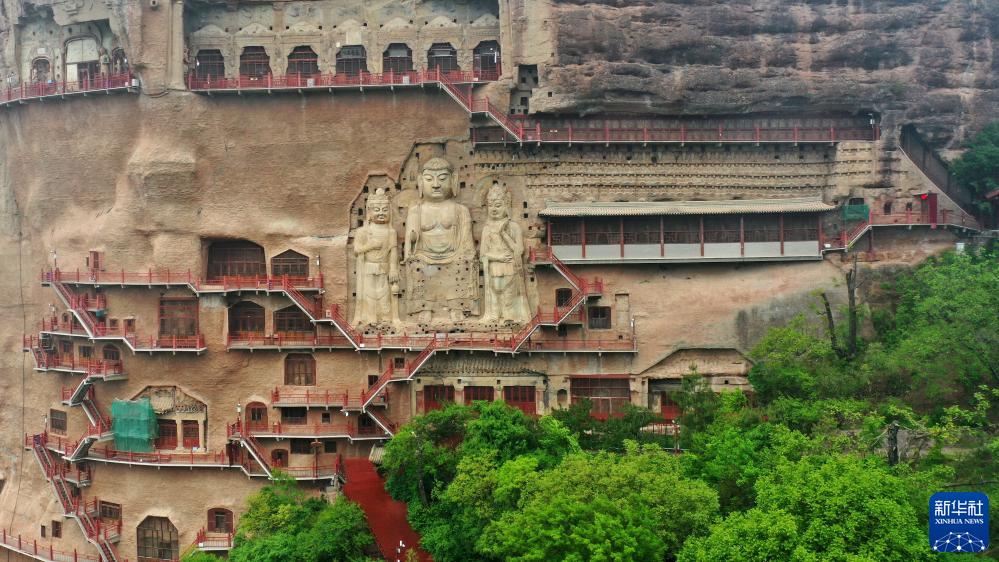 這是2022年4月29日在甘肅省天水市拍攝的麥積山石窟(無(wú)人機照片)。