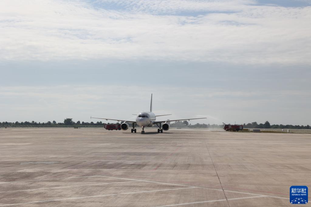 10月16日,在柬埔寨暹粒吳哥國際機場(chǎng),首架進(jìn)港客機降落后通過(guò)水門(mén)。