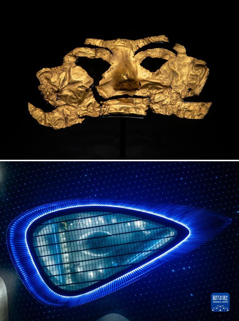 這是一張拼版圖片,上圖為:在位于四川廣漢市的三星堆博物館拍攝的金面具(2021年3月17日攝);下圖為:10月16日晚拍攝的2023成都世界科幻大會(huì )主場(chǎng)館——成都科幻館屋頂的“科幻之眼”(無(wú)人機照片)。這是屋頂內嵌的一塊面積為1382平方米的玻璃采光頂,寓意宇宙年齡138.2億年,其設計元素來(lái)源于三星堆金面具上的“古蜀之眼”。
