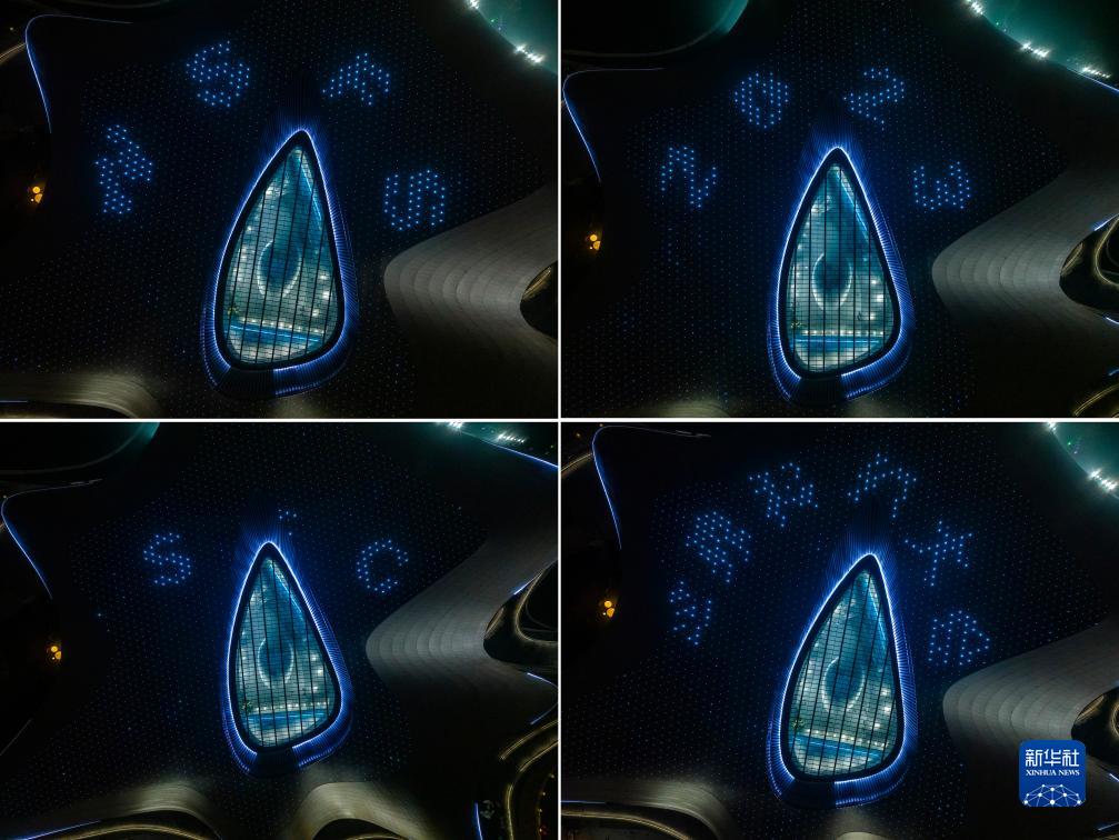 這是10月16日晚拍攝的2023成都世界科幻大會(huì )主場(chǎng)館——成都科幻館,燈光在其屋頂上打出“WSFS(世界科幻協(xié)會(huì ))”“2023”“SC(四川)”“世界科幻大會(huì )”字樣(無(wú)人機拼版照片)。