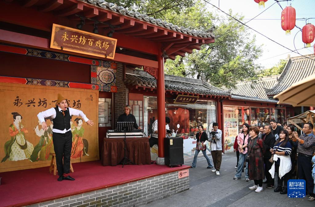 10月16日,來(lái)自斯洛伐克法帝西摩劇院的默劇表演藝術(shù)家弗拉基米爾·庫利塞克(左)在西安永興坊進(jìn)行惠民巡演。