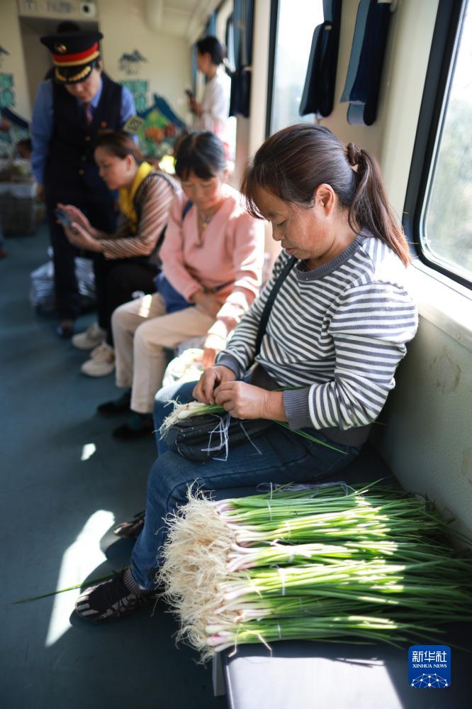 10月17日,沿線(xiàn)村民在5630次列車(chē)上整理農產(chǎn)品。