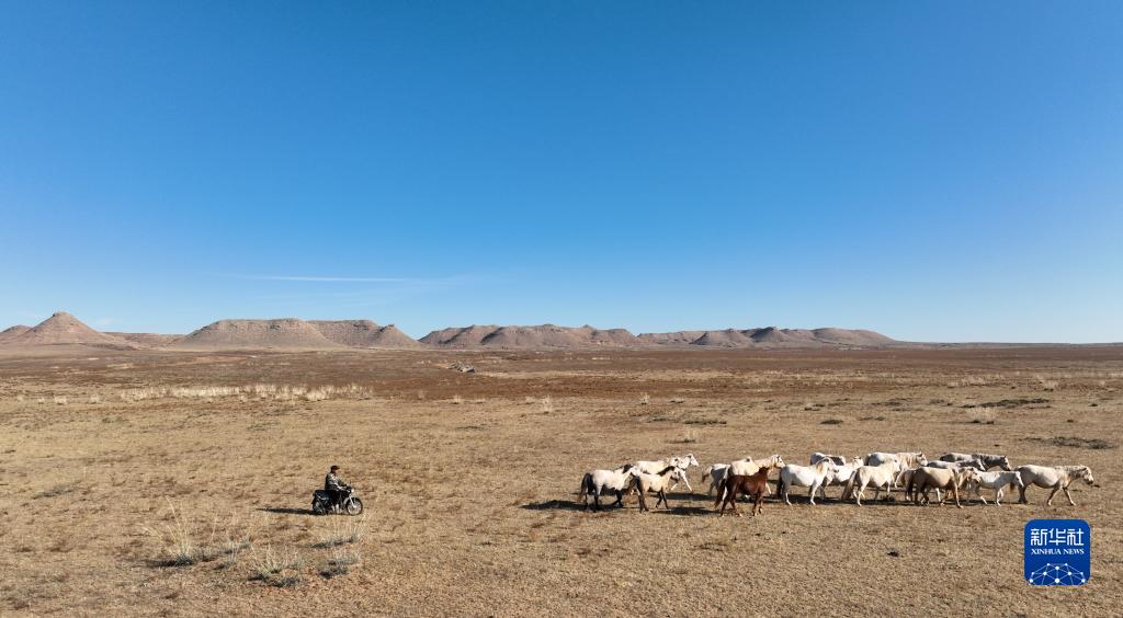 10月16日,道爾吉在草原上驅趕馬群(無(wú)人機照片)。