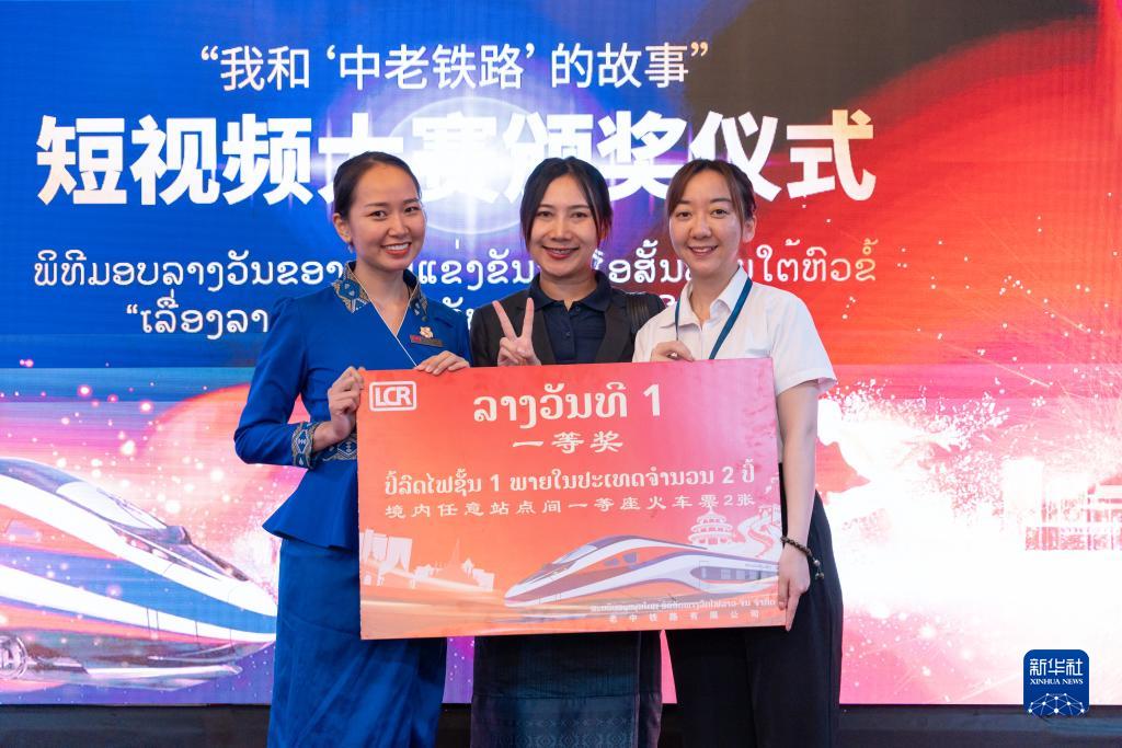 由中國駐老撾大使館舉辦的“我和‘中老鐵路’的故事”短視頻大賽16日在老撾首都萬(wàn)象舉行頒獎儀式。老撾新聞文化旅游部副部長(cháng)萬(wàn)西與中國駐老撾大使館臨時(shí)代辦王暢共同為獲獎?wù)哳C獎。