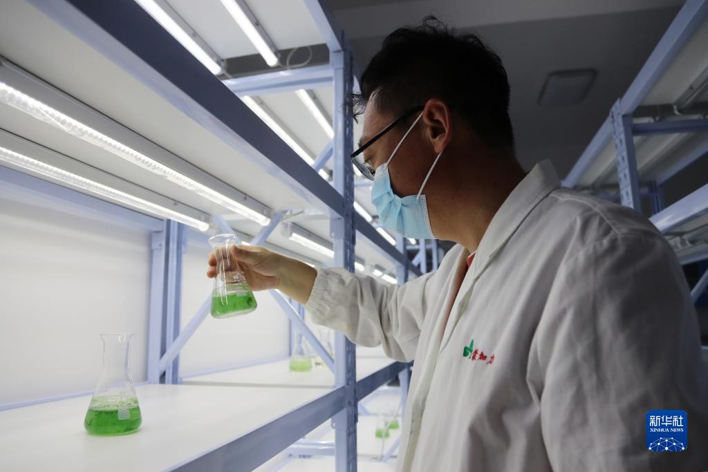 10月17日,園區工作人員查看螺旋藻樣品。