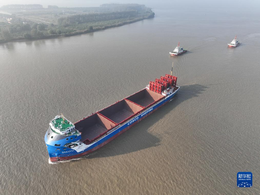 10月18日,中遠海運萬(wàn)噸級電動(dòng)集裝箱船在長(cháng)江試航(無(wú)人機照片)。