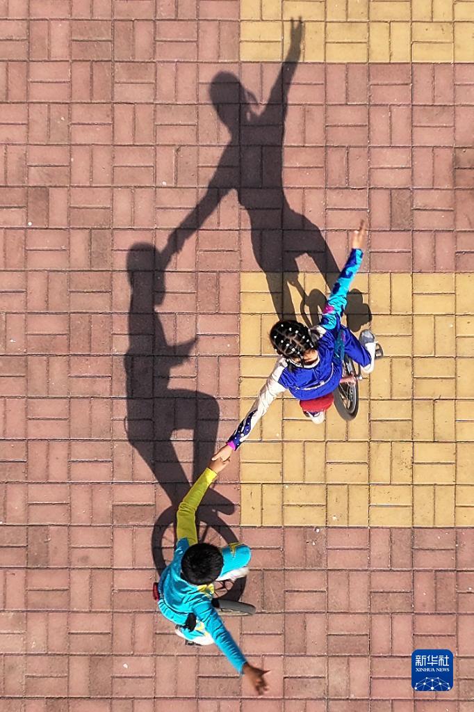 10月18日,雜技學(xué)員在河北省滄州市吳橋縣于集鎮東街一特色雜技小院練習雜技(無(wú)人機照片)。