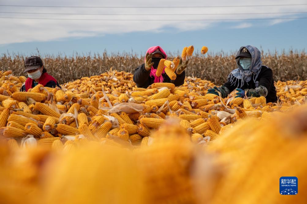 10月18日,在黑龍江省綏化市北林區張維鎮潤地農業(yè)種植合作社晾曬場(chǎng),村民在擺放剛剛收獲的玉米。
