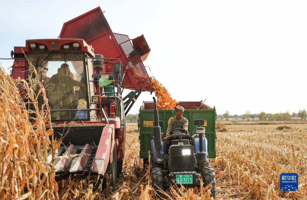 10月18日,在鄂爾多斯市達拉特旗展旦召蘇木柳林村,農民將玉米裝入運糧車(chē)。