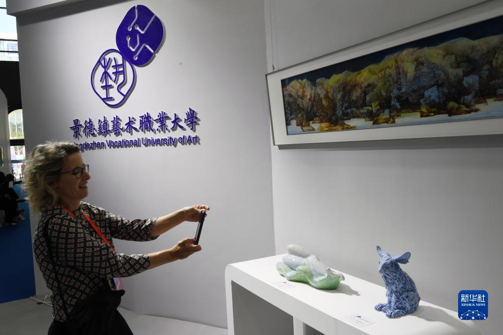 10月18日,一名外國參觀(guān)者在瓷博會(huì )高校展區拍攝陶瓷藝術(shù)品。