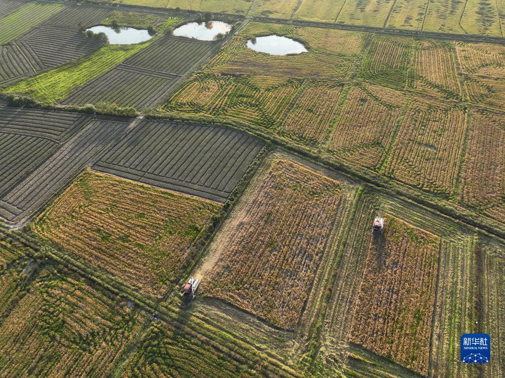 10月18日,湖南省衡陽(yáng)市衡山縣白果鎮,農民在收割晚稻(無(wú)人機照片)。
