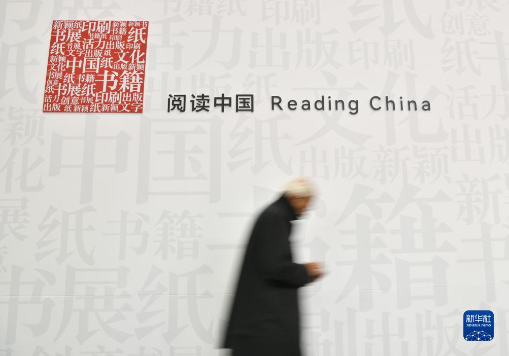 10月18日,一名參觀(guān)者經(jīng)過(guò)德國法蘭克福書(shū)展中國展區的展板。