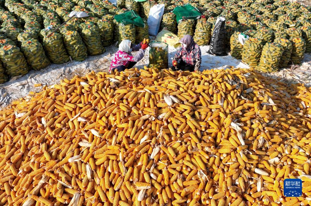 10月18日,唐山市豐南區王蘭莊鎮的農民將收獲的玉米裝袋、儲存(無(wú)人機照片)。