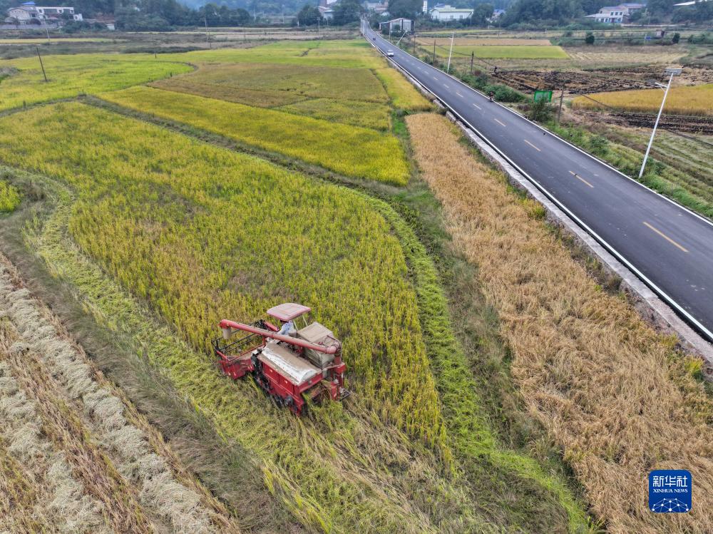 10月19日,在湖南省湘潭市雨湖區鶴嶺鎮晶鑫村,農戶(hù)駕駛農機在農田里收割水稻(無(wú)人機照片)。