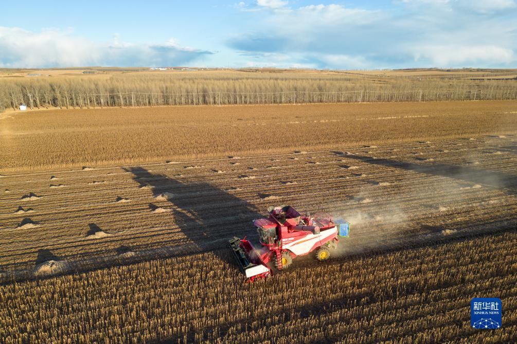 10月19日,收割機在齊齊哈爾市甘南縣中興鄉綠化村的一處大豆地收獲大豆(無(wú)人機照片)。