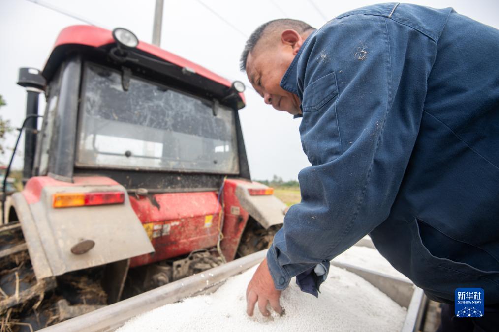 10月19日,在湖北省荊門(mén)市沙洋縣曾集鎮金雞村,農民將化肥放入播種機械。