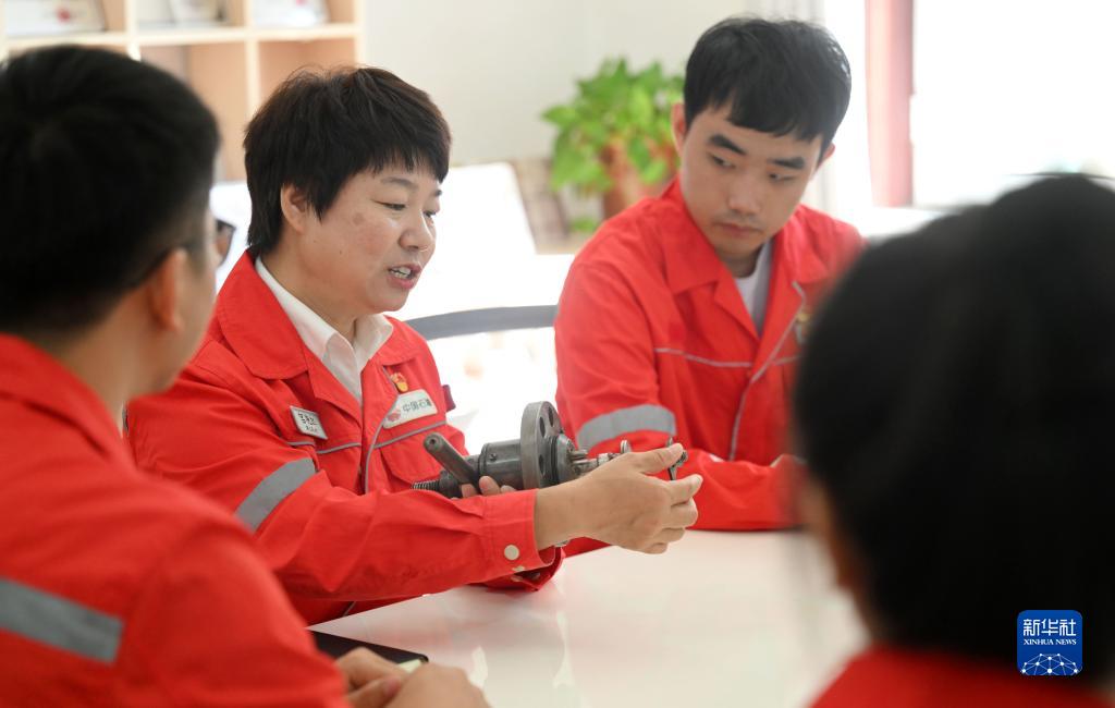 10月18日,在中國石油大港油田第三采油廠(chǎng)“宮艷紅勞模創(chuàng )新工作室”,宮艷紅(左二)和工作室成員討論設計方案。
