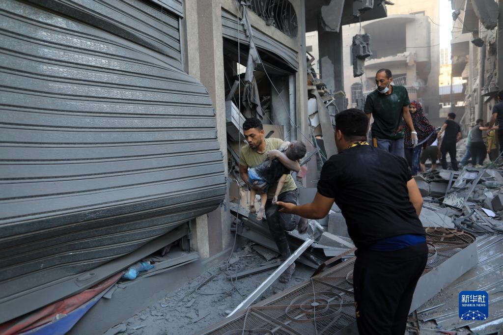10月19日,在加沙地帶南部城市汗尤尼斯,人們在遭以色列空襲后的建筑廢墟中救援傷者。
