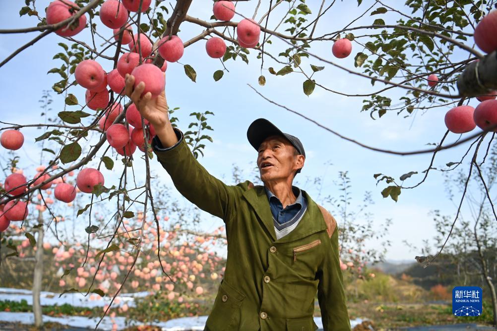 10月19日,南溝村果農胡福義在自家果園查看蘋(píng)果長(cháng)勢。
