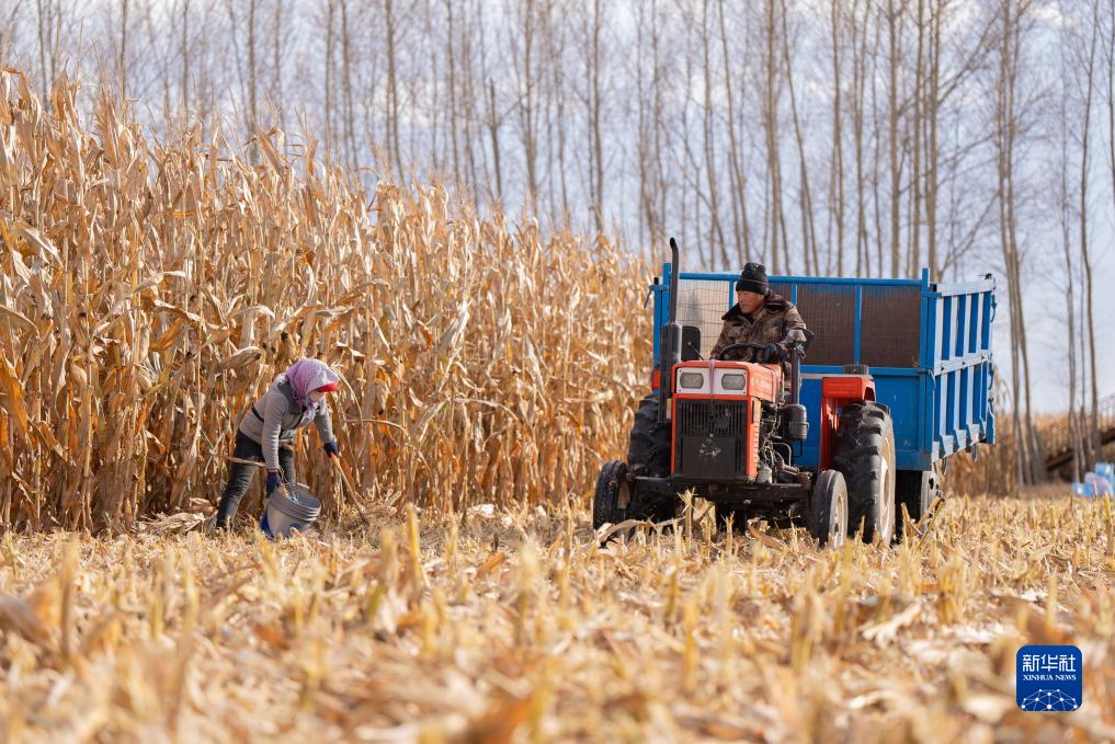 10月19日,在黑龍江省肇東市五里明鎮東升村,農民在田間駕駛拖拉機準備運輸收獲的玉米。