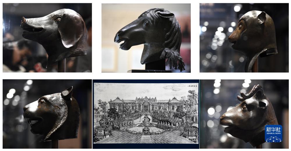 這是一張拼版照片:上三圖分別是豬首、馬首、猴首銅像(從左至右);下三圖分別為虎首銅像、現場(chǎng)展出的可看出十二獸首當年位置的圓明園銅版畫(huà)、牛首銅像(從左至右,10月20日攝)。