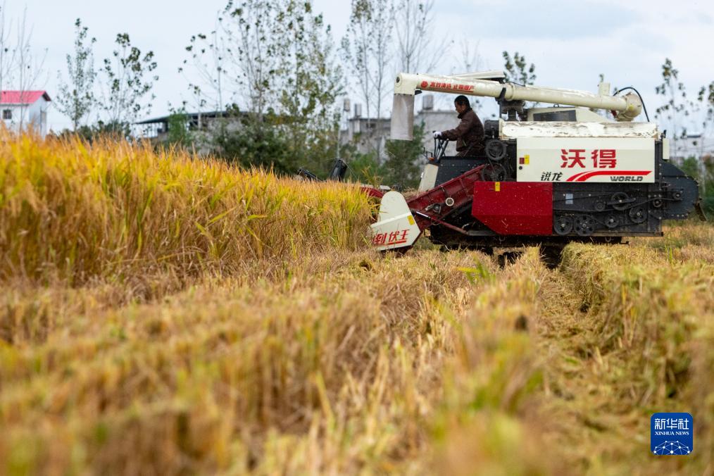 在湖北省天門(mén)市石家河鎮唐店村,農民操作農機收割水稻(10月19日攝)。
