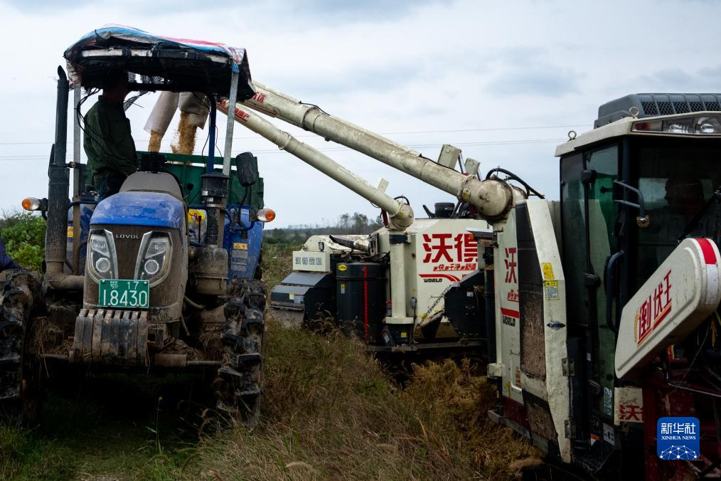 在湖北省天門(mén)市石家河鎮唐店村,農民將收割的水稻裝車(chē)(10月19日攝)。