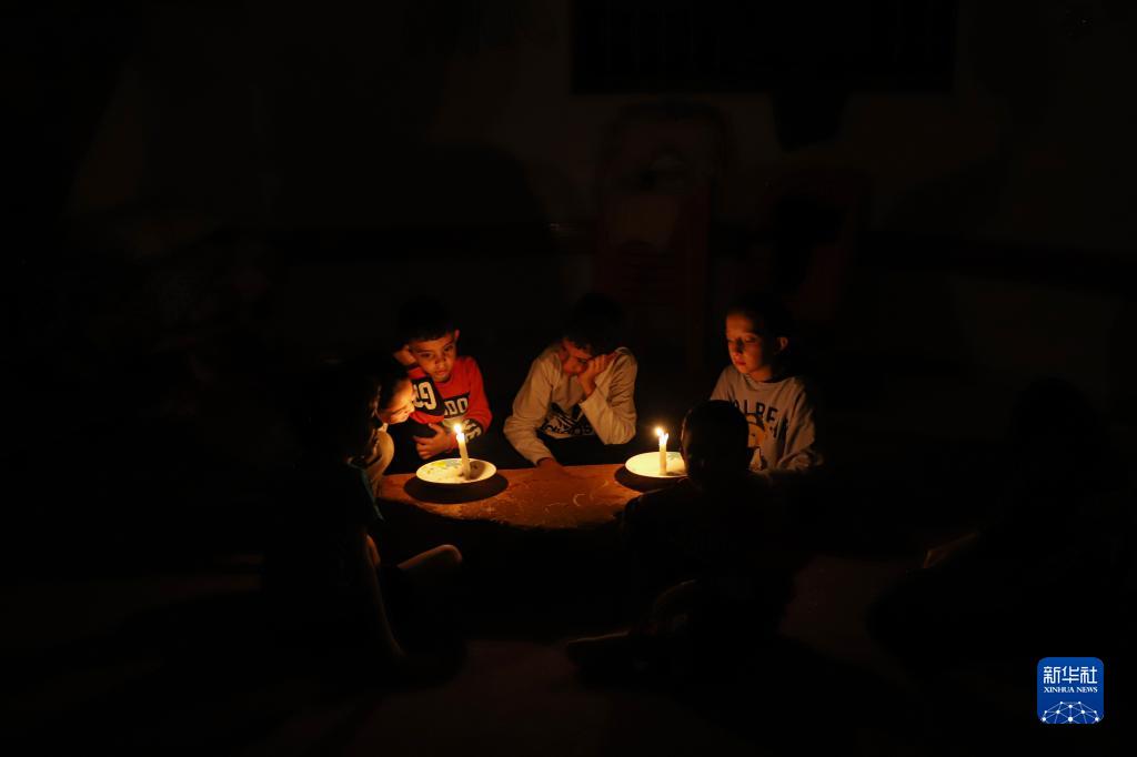 這是10月20日在加沙地帶南部城市汗尤尼斯拍攝的使用蠟燭照明的兒童。