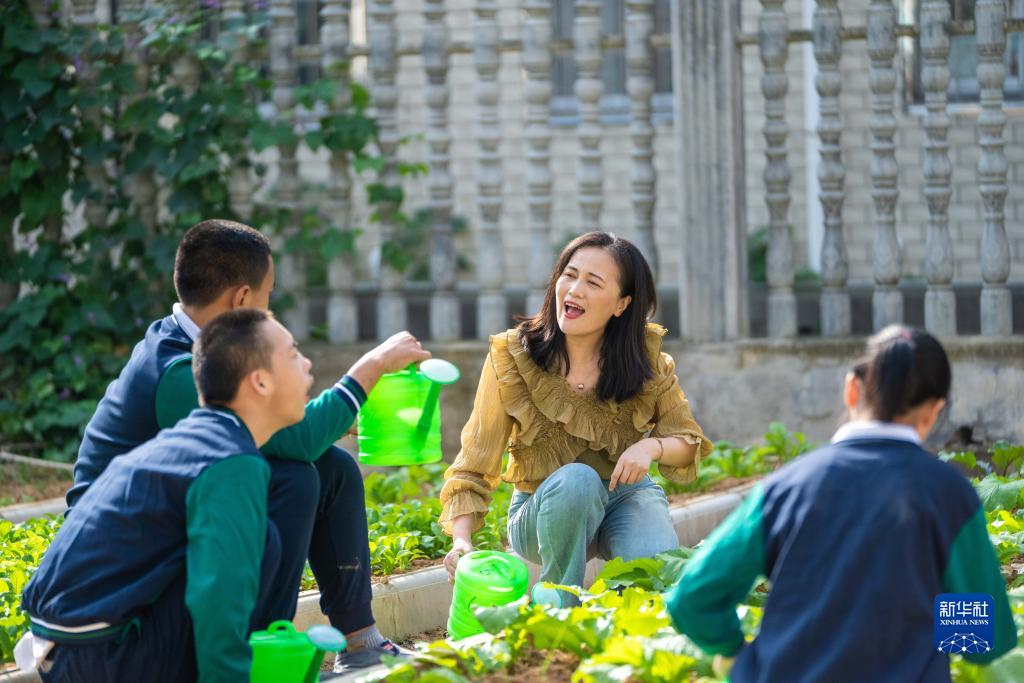 10月19日,常德市桃源特殊教育學(xué)校校長(cháng)彭敏(右二)和學(xué)生參與勞動(dòng)實(shí)踐活動(dòng)。