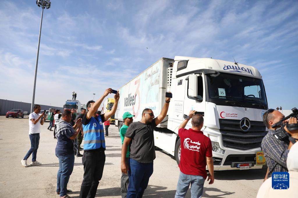 10月21日,在拉法口岸埃及一側,裝載有人道援助物資的貨車(chē)準備通過(guò)拉法口岸。