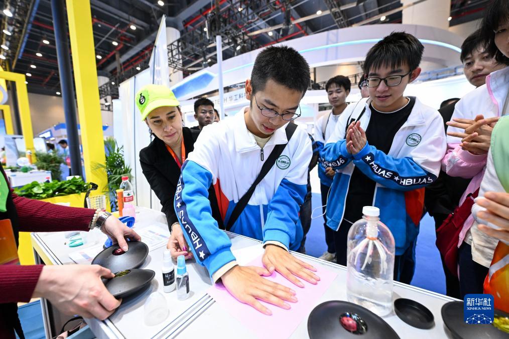 10月20日,學(xué)生在俄羅斯展臺與科普人員互動(dòng)。