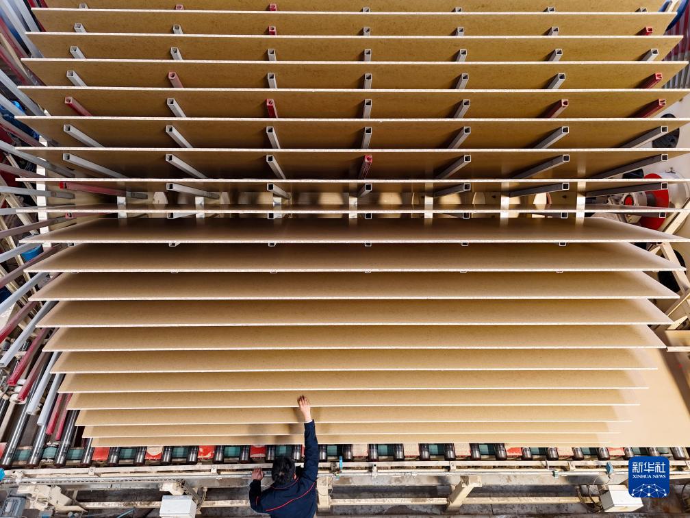 10月21日, 在山東省臨沂市蘭山區新港集團的生產(chǎn)車(chē)間,車(chē)間工人在對剛下線(xiàn)的刨花板進(jìn)行外檢(無(wú)人機照片)。