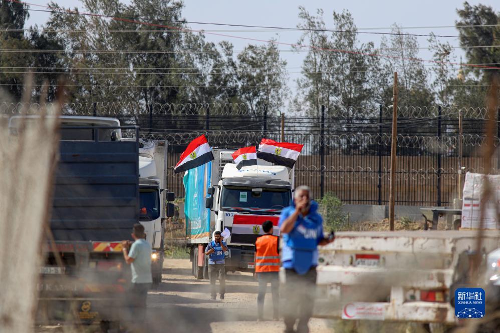 10月21日,裝載有人道援助物資的貨車(chē)通過(guò)拉法口岸進(jìn)入加沙地帶。