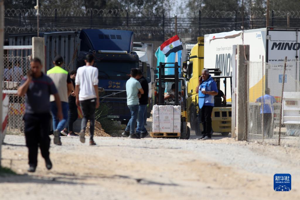 10月21日,工作人員在加沙地帶南部城市拉法卸貨。